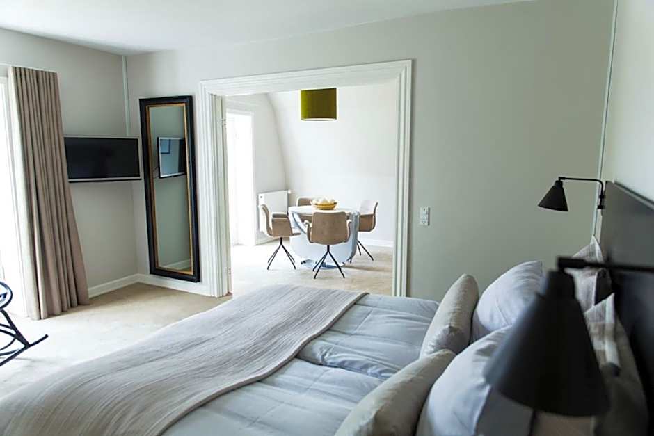 This modern suite features a sofa, dining table and desk.